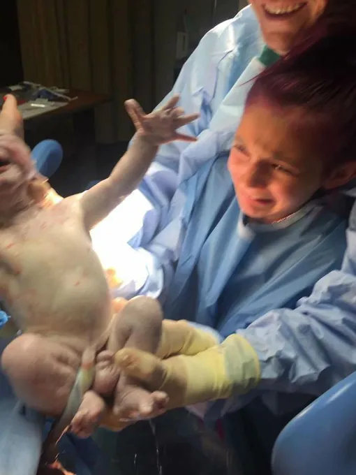 Эмоции, отразившиеся на лице Джессики, сохранились на этих фотографиях. Изначально план был в том, что она только постоит рядом, и перережет пуповину, но в какой-то момент их доктор смешал все планы.