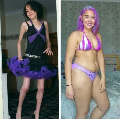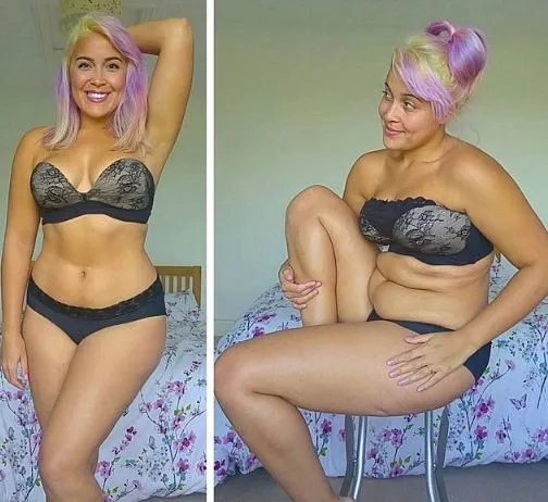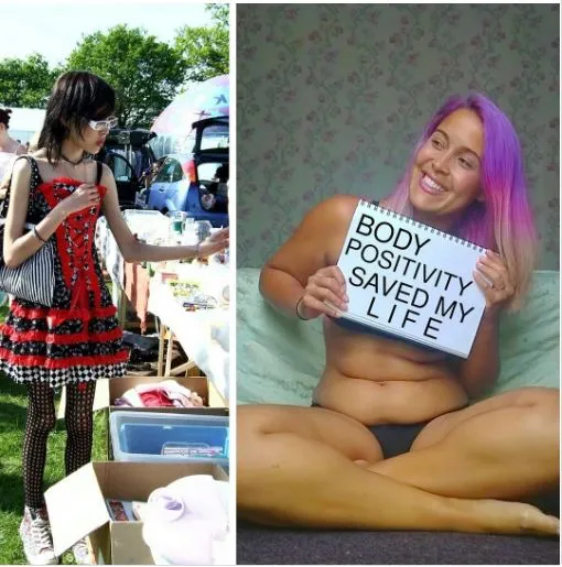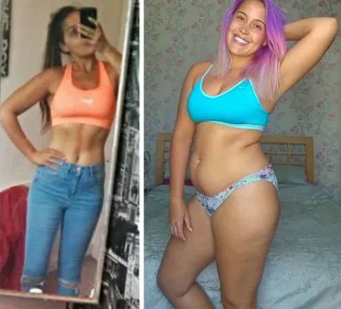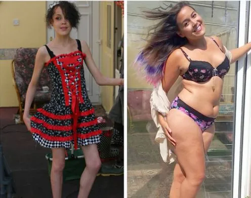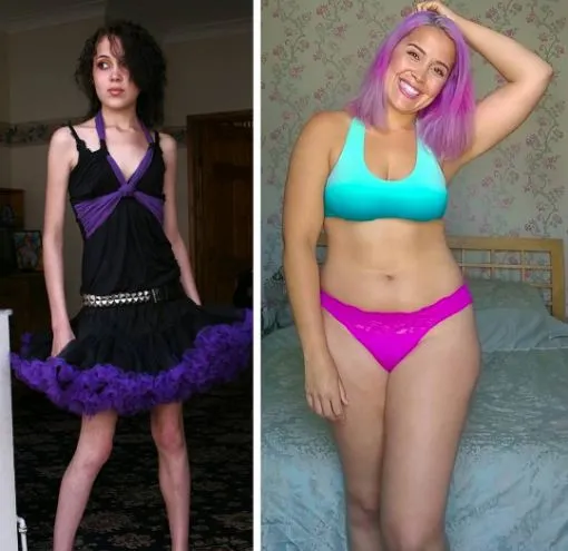 На фотографиях «до», она щуплая девочка-подросток, на фотографиях «после» — светящаяся здоровьем женщина. «Та я, которая слева — жертва социального давления. Я должна была быть стройной, потому что... А почему, собственно я кому-то это была должна? На фото справа — тоже я, но наслаждающаяся своей жизнью. Я наконец могу быть самой собой и мне невероятно комфортно в моем теле».