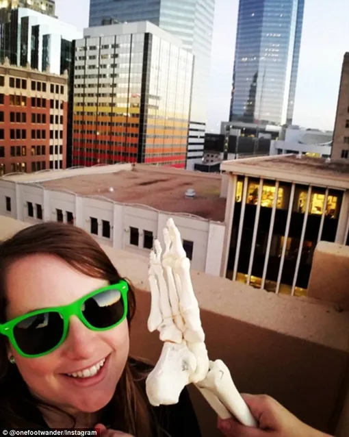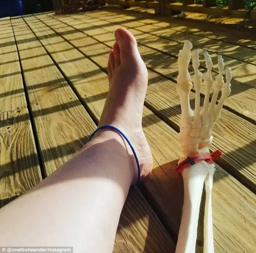 Но Кристи не унывает. Собирать деньги на свое лечение она решила необычным способом: заведя в Инстаграме (Социальная сеть признана экстремистской и запрещена на территории Российской Федерации) аккаунт @onefootwander («странствующая нога»). В нем она публикует фотографии скелета ноги в необычных местах: на морском побережье, у одинокого маяка, на фоне городского заката и в окружении разноцветных фонариков.