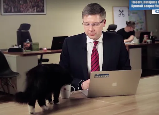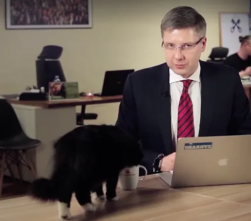 Мэр Риги Нил Ушаков давал серьезное интервью, посвященное ремонту городских дорог. Однако был вынужден прерваться: на стол главы города запрыгнула его кошка Думка, неторопливо подошла к кружке мэра и стала из нее пить.