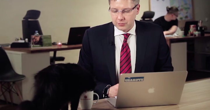 Мэр Риги Нил Ушаков давал серьезное интервью, посвященное ремонту городских дорог. Однако был вынужден прерваться: на стол главы города запрыгнула его кошка Думка, неторопливо подошла к кружке мэра и стала из нее пить.