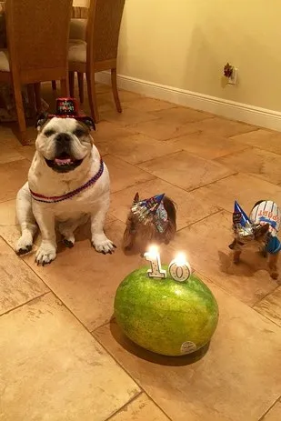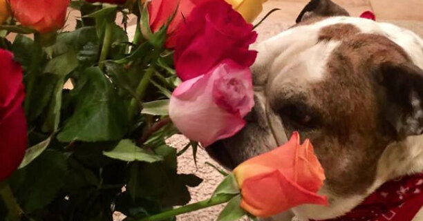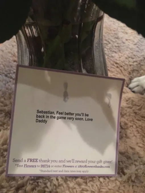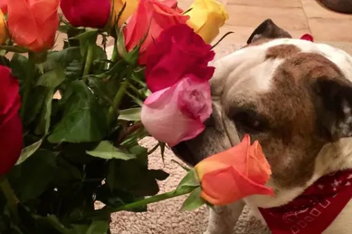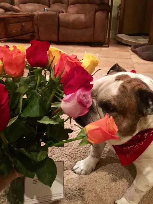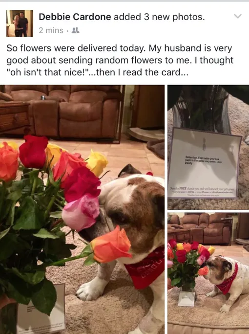 10-летний английский бульдог Себастьян перенес операцию на суставе, из-за чего сильно грустил. Любящий хозяин решил морально поддержать питомца и прислал для него букет с вложенной запиской: «Себастьян, держись веселей. Скоро ты снова будешь в игре. Люблю, Папа».