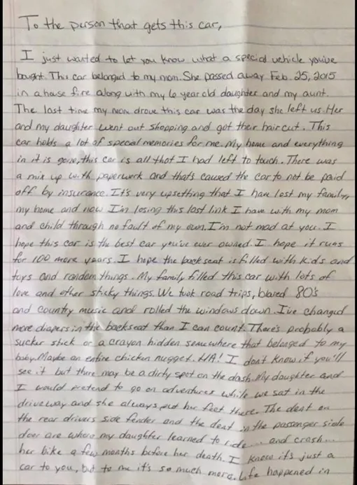 Я просто хочу, чтобы вы знали, какую особенную машину вы приобрели. Автомобиль принадлежал моей матери. Она погибла в пожаре 25 февраля 2015 года вместе с моей шестилетней дочерью и тетей. В последний раз она была за рулем этой машины за день до этого. Они втроем отправились по магазинам и в парикмахерскую.