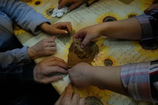 Инесса, тифлосурдопереводчик и преподаватель жестового языка, залетает в небольшой зал. Она все делает быстро — ставит мне третий стул, помогает сесть незрячему Саше, делает глоток чая из термокружки. Три часа до работы и три часа с работы, постоянный ситуативный перевод для всех подопечных Дома слепоглухонемых, уроки. На выходных она тоже переводит на церковных службах. Тяжело? Ну конечно тяжело, но слепоглухие и глухие же знают, что Инесса сама ходит в храм, не откажешь.