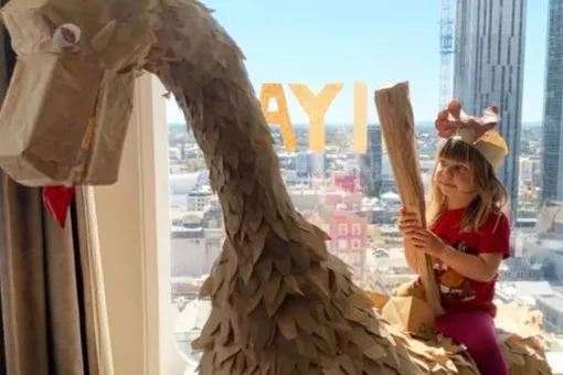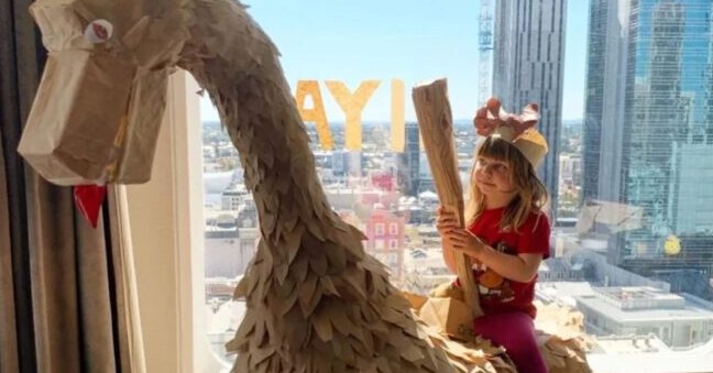 Две недели взаперти в гостиничном номере с активной трехлеткой — испытание не для слабонервных. Но Карли и Сэм придумали, как пустить энергию Флоренс в мирное русло. Семья решила построить динозавра в человеческий рост, используя только подручные материалы. У них были одноразовые столовые приборы, гладильная доска, которая послужила каркасом для древнего чудища — и крафтовые пакеты из-под доставки еды. Море крафтовых пакетов.