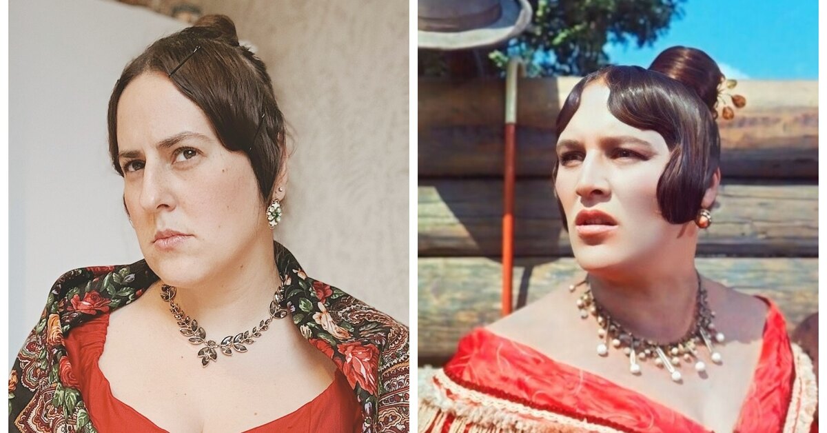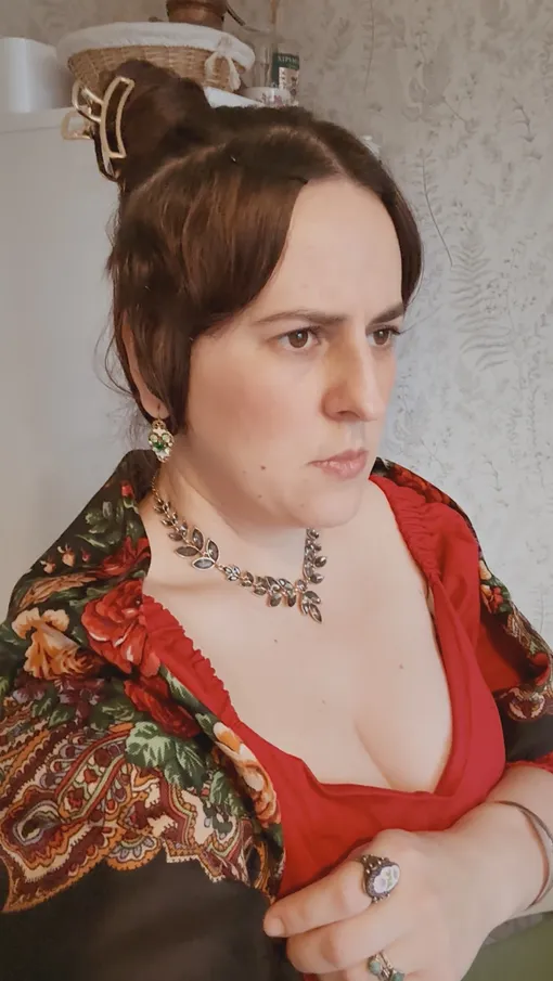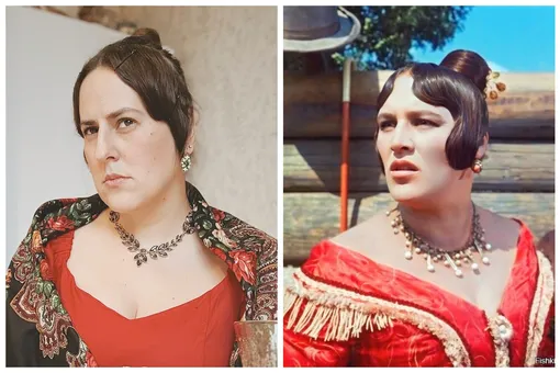 Повторить интонации и мимику Нонны Мордюковой невозможно, уверяет Мария, но сделала что могла: купила блузку, похожую на верх платья купчихи, и классический платок, надела винтажные перстни и серьги «побогаче». С большим трудом соорудила причёску — длины волос не хватает. Тренировалась перед зеркалом, «пристреливала» кадры, отрабатывала фирменный прищур, чтобы получилось похоже, узнаваемо. А вот и результат: