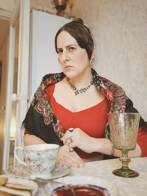 А вот с платьем вышла накладка. «После нескольких часов съёмок с вазами, гвоздиками и другим доморощенным реквизитом, меня покинули силы, и я уговорила себя, а потом и остальных, что обновленная Людмила Прокофьевна будет современной дамой в моём чёрном платье. Чокер есть? Есть. Книги есть? Есть. В общем, вот она, Прокофия Людмиловна 50 лет спустя!» — делится блогер.