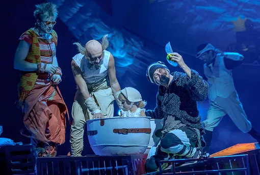 В интерпретации Театра нация эта история обрастает новыми подробностями и персонажами. Царица ночи, Торт Наполеон, оркестр заводных обезьянок, синий павлин — хранитель времени, чудовища и монстры из шкафа — таких неожиданных встреч будет много. «Синяя-синяя птица» впечатляет яркими музыкальными номерами, трюками и спецэффектами, но при этом, что очень важно, не теряет глубины первоисточника.