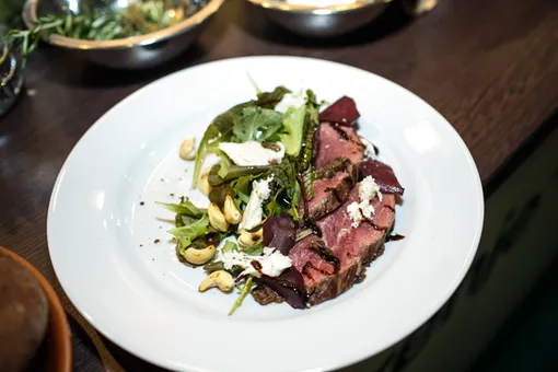 Серию мастер-классов журнала открыл персональный мясник Steak@home Павел Поцелуев. Он приготовил салат с печеной свеклой и моцареллой и стейк Рибай с овощами гриль и сливочным маслом с добавлением голубого сыра.