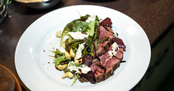 Серию мастер-классов журнала открыл персональный мясник Steak@home Павел Поцелуев. Он приготовил салат с печеной свеклой и моцареллой и стейк Рибай с овощами гриль и сливочным маслом с добавлением голубого сыра.