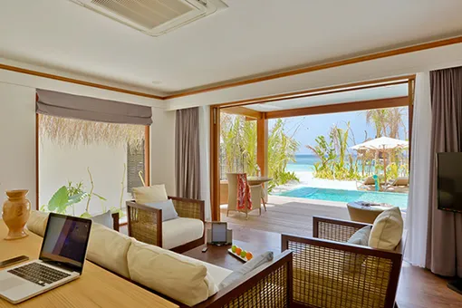 Все виллы выполнены в стиле местной архитектуры, с современным интерьером и оснащены по последнему слову техники. Внешний вид вилл крытых соломой является типичным образцом архитектуры Мальдивских островов, а дизайн интерьеров современный и лаконичный. Мебель и сантехника были сделаны на заказ в Европе, полы и часть стен облицованы древесиной ценных пород деревьев. Все виллы были спроектированы дизайнером Kanneth Cobonpue, которая славится работой с натуральными материалами.