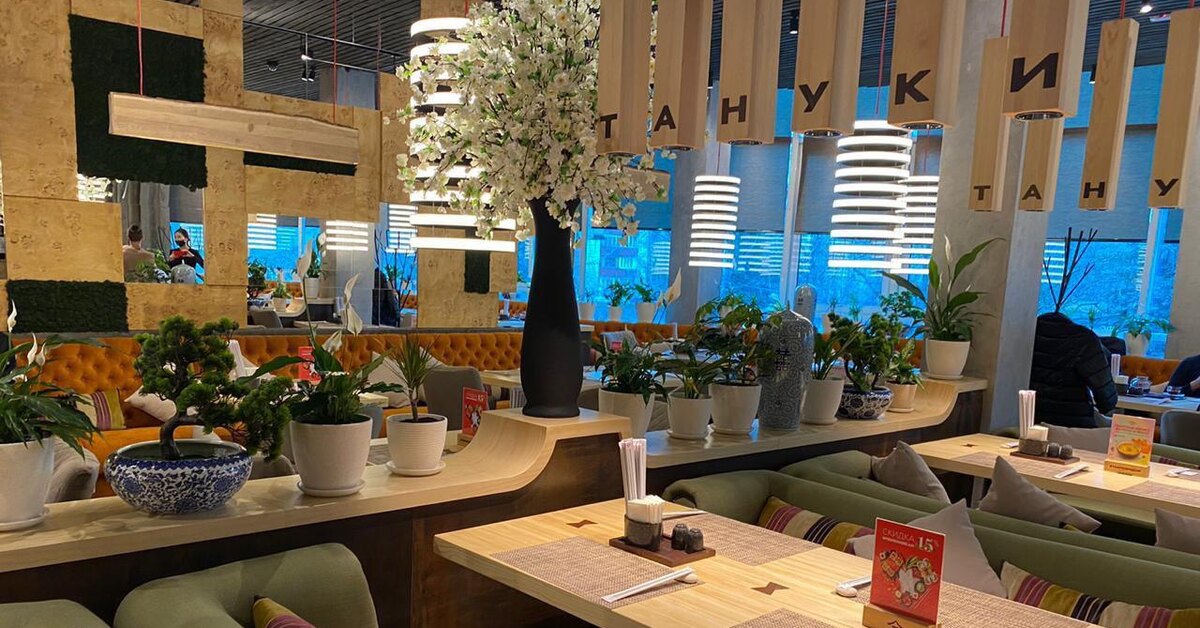 Ресторан с детской игровой зоной выполнен в новом фирменном стиле «Тануки». Просторные залы с панорамными окнами расположены на 2 и 3 этаже торгового центра и рассчитаны на 122 посадочных места. Планировка предусматривает как столики на двоих и четверых человек, так и столы для больших компаний. В дизайне интерьеров актуальные тенденции сочетаются с традиционными японскими мотивами – самурайскими мечами, ветками цветущей сакуры, деревцами бонсай, расписными вазами.