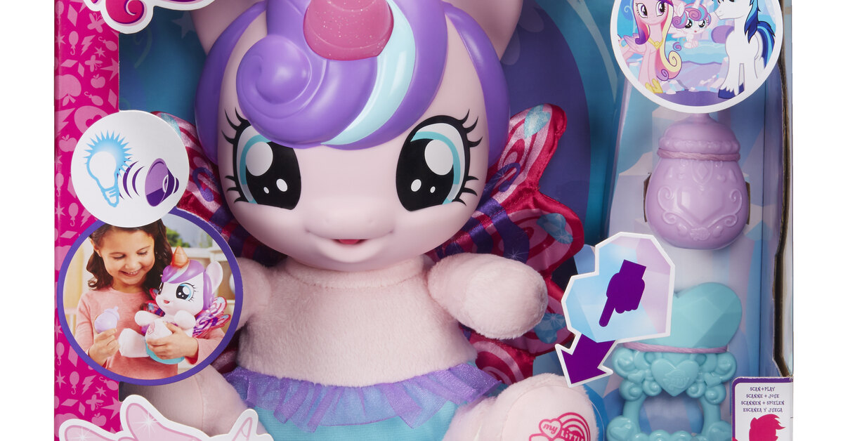 В волшебном мире Эквестрии произошло грандиозное событие — у принцессы Каденс родилась дочка. Теперь каждая девочка сможет понянчить плюшевую малышку. Рог, венчающий голову маленькой пони-принцессы, сияет разными цветами. Игрушка реагирует на прикосновения — она засмеется, если погладить ее по животику, у нее светится рог и она реагирует на громкие звуки. Малышку можно покормить из специальной бутылочки, которая идет с игрушкой в комплекте. Предназначена для детей от 3 лет.