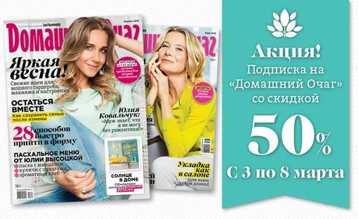 Подарите своим любимым мамам и подругам (а может быть, и себе) приятный и практичный подарок — годовую подписку на любимый журнал «Новый очаг»! Ведь в преддверии 8 марта мы дарим на нее скидку 50%!