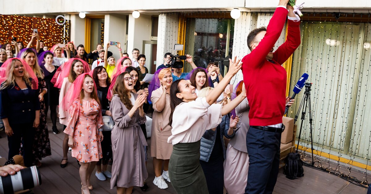 Девушки примерили на себя разноцветную фату, а петлицы костюмов мужчин, которые, скорее всего, впервые в жизни побывали на девичнике, украшали бутоньерки из живых цветов. Их на входе всем пришедшим вручали собственноручно артисты постановки.