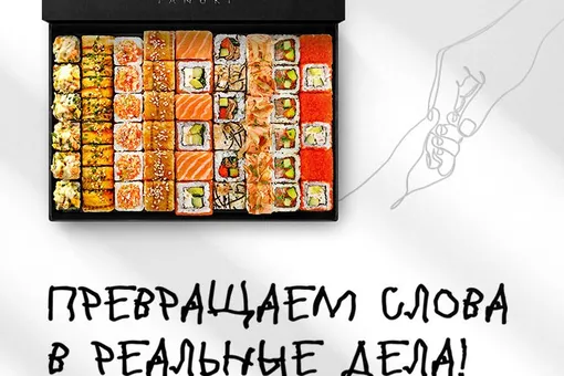 Сет «Доброшрифт» — полностью благотворительная инициатива: в составе собраны хиты меню «Тануки» без наценки, компания самостоятельно перечисляет 100 рублей с каждой проданной позиции. Набор доступен при заказе доставки через сайт, кол-центр или мобильное приложение, в залах ресторана взять его можно, но только навынос.