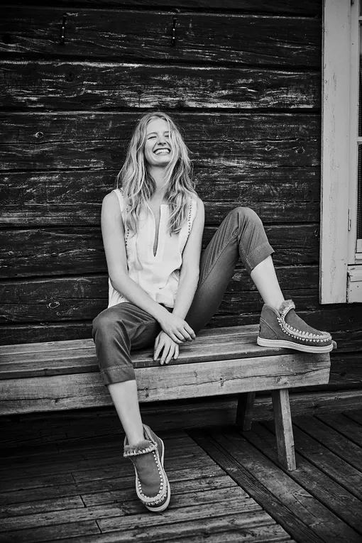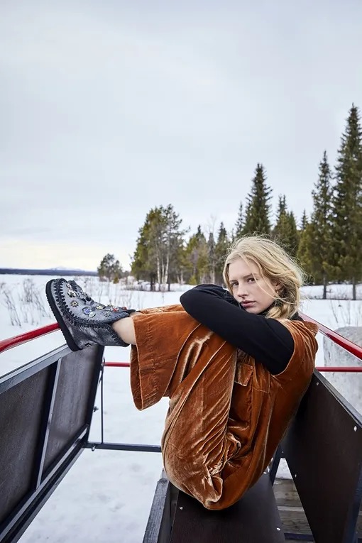 Цветовую палитру дополнили новые цвета и фактуры: «геккон», «пыль» и «металлизированный камуфляж». Этичное производство и лучшие натуральные материалы — отличный выбор для комфортного пребывания на склонах и не только. Ключевые модели линии après ski с отделкой голенища мехом кролика или козы — современная интерпретация образов из романа «Доктор Живаго». Для более повседневных образов подойдут «ловцы снов» с отделкой из овчины на спортивной или классической подошве, а также станут идеальным вариантом после долгого дня, проведенного на склоне. Дань бохо-стилю: линия mou wood heel заново интерпретирует невысокие клоги из 70x, визуально удлиняющих ногу и максимально комфортных в носке. Ключевая модель — клоги на монолитной деревянной подошве с фиксирующим стопу ремешком с меховой подкладкой из тосканы.