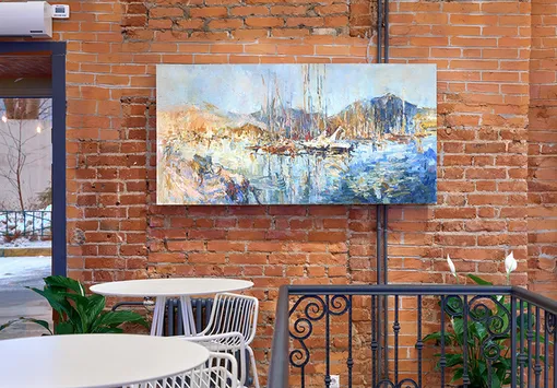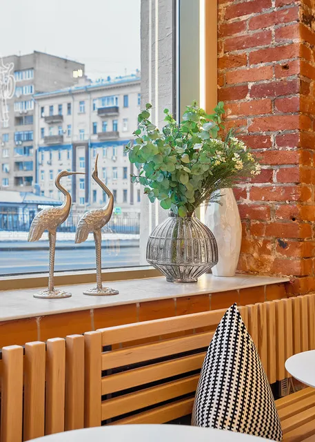 Совсем недавно открылась «Брусника» на Плющихе, в литературном сердце столицы. Здесь когда-то жил Лев Толстой, Андрей Белый, Афанасий Фет. Интерьер нового кафе как раз объединяет эпоху модерна и функционального конструктивизма. На потолке геометрический рисунок соседствует с буковыми вертикалями, а цветовая гамма всего заведения теплая, золотисто-кирпичная.