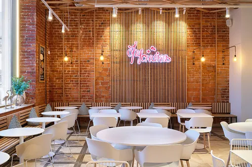 Юлия Артемьева часто выступает главным дизайнером интерьеров и всегда следит за ходом строительства кафе. Именно ей принадлежит идея сделать мебель и декор в кафе светлым — это позволяет визуально расширить пространство и придать ему легкость.