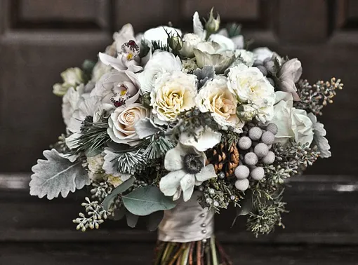 В зимней свадьбе в качестве дополнения для составления композиций можно использовать серебряные или выбеленные веточки, кристаллы и бусины, аккуратные посеребреные шишки. Мелкие белоснежные соцветия гипсофилы напоминают слетевшиеся в облачка снежинки, поэтому могут подойти для создания букета только из этих цветов. Кроме того, для ассоциации со снегом очень подходят раскрывшиеся коробочки хлопка, которые добавляют в букет в качестве деталей. Нежно и свежо в зимнем букете выглядят анемоны или ранункулюсы.