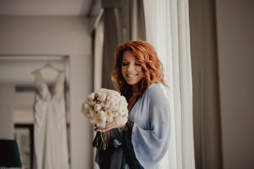 Если ваше платье пышное или со шлейфом или с большим количеством кружев, вам подойдет более сдержанный по форме букет и скорее всего с моно-цветами, чтобы он не спорил, а лишь подчеркивал ваш образ. Если же, напротив, ваше платье по фигуре или легкое по текстуре и силуэту, то чтобы сделать его более ярким или торжественным, вам подойдет современный по стилю букет из разных по форме и по оттенкам цветов, листьев, веточек, несколько небрежный, бесформенный, но с характером и стилем.