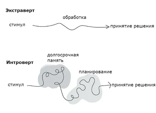 1. Мозг интроверта обрабатывает информацию гораздо более длинным путем. Если экстраверт, получив стимул, выдает быструю нервную реакцию, то интроверт обрабатывает полученный стимул в отделах мозга, отвечающих за долгосрочную память и планирование.