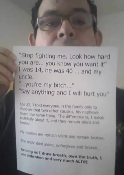 «Ты моя с***а... Только скажи что-нибудь, и я сделаю тебе больно». Мне 22, я рассказал своей семье, что произошло, и узнал, что двое других моих двоюродных братьев, его племянников, пережили то же самое. Разница была в том, что я рассказал об этом, а они промолчали и сломались. Мои двоюродные братья до сих пор молчат. И все еще сломлены. Дядя умер в одиночестве, непрощенный и сломленный. Как только я восстановил дыхание и рассказал об этом, я перестал чувствовать себя разбитым. Зато почувствовал себя ЖИВЫМ.
