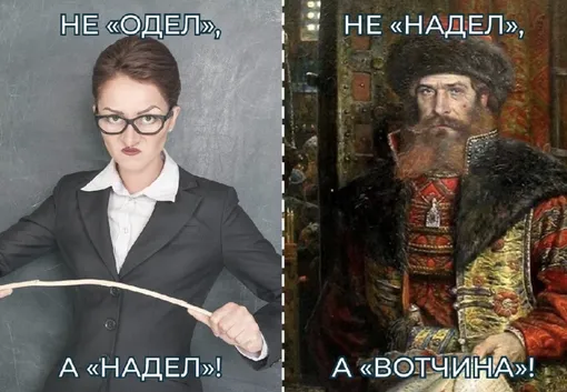 Один из самых популярных мемом про учителя русского и литературы — про слова «одел» и «надел». Напомним, что существительное «надел» означает участок земли, который выделяли в пользование крестьянской семье в дореволюционное время.