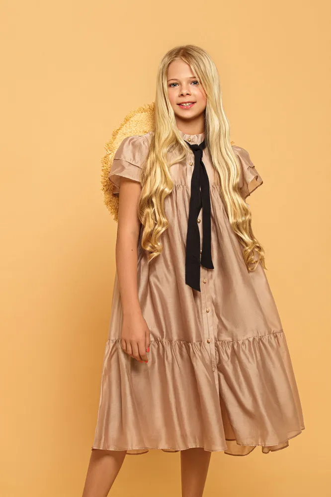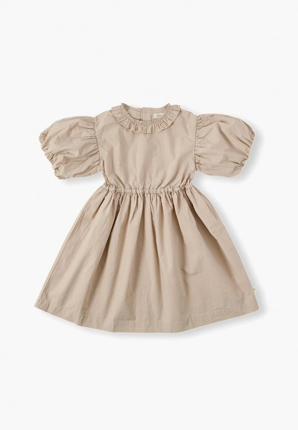 Для любительниц спокойных и нейтральных оттенков нашли базовое детское платье в бежевом оттенке. Девочкам такое платье тоже понравится благодаря рукавам-фонарикам и пышной юбке-солнцу.