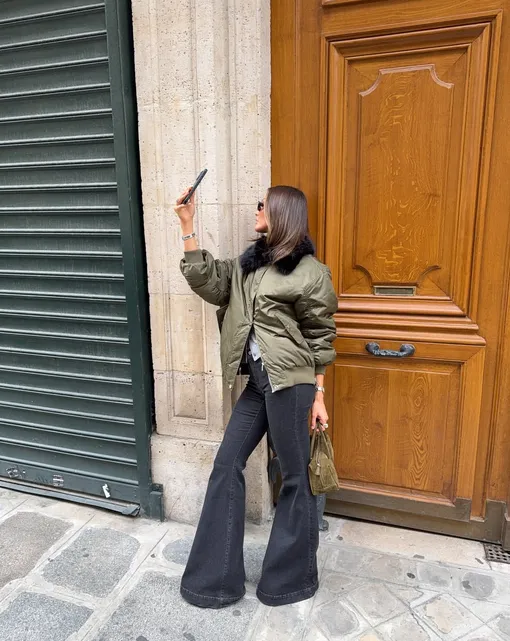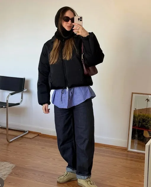 Француженки умеют превращать объемный пуховик в элемент утонченного силуэта. Секрет — широкие брюки с высокой посадкой: они вытягивают фигуру, добавляют легкость движения и делают образ максимально гармоничным. Длина пуховика может быть любой — от укороченной до макси. Завершите look лаконичными ботильонами или минималистичными кроссовками, и вы получите городской аутфит, который одновременно расслабленный и безупречно стильный — настоящий парижский прием.