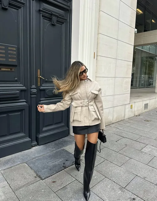 Француженки редко упускают возможность подчеркнуть талию — даже поверх объемной верхней одежды. Акцентный ремень (кожаный, без броской фурнитуры, в тон к пуховику или контрастный) делает силуэт более собранным, превращая даже пуховик-maxi в элегантную верхнюю одежду. Прием особенно эффектен в монохромных образах: бежевый на бежевом, черный на черном.