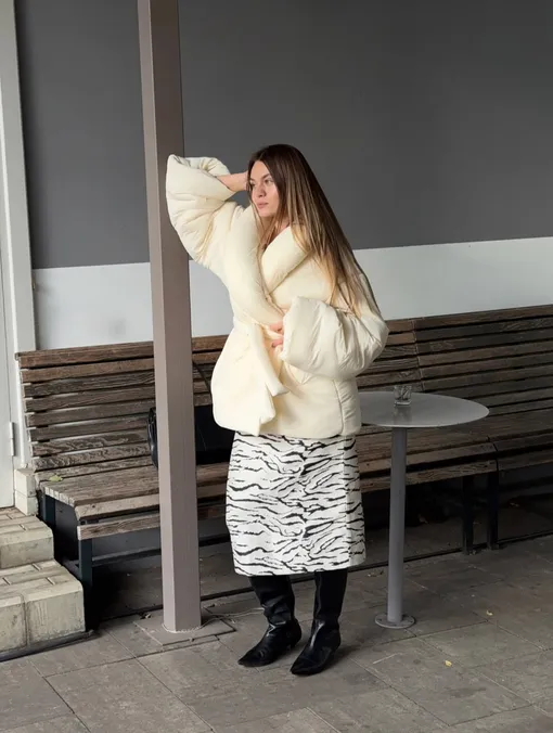 Француженки обожают игры с силуэтами, и эта комбинация — один из их лучших приемов. Прямой или слегка приталенный пуховик сверху и аккуратный жакет под ним создают продуманный многослойный образ, где каждая деталь видна и работает на общий силуэт. Результат — идеальный баланс: жакет четко формирует линию плеч и талии, а пуховик добавляет легкий объем и динамику. Многослойность здесь не перегружает, а подчеркивает утонченность и внимательность к деталям — настоящий парижский лайфхак для современного зимнего образа.