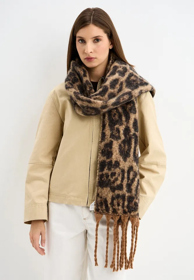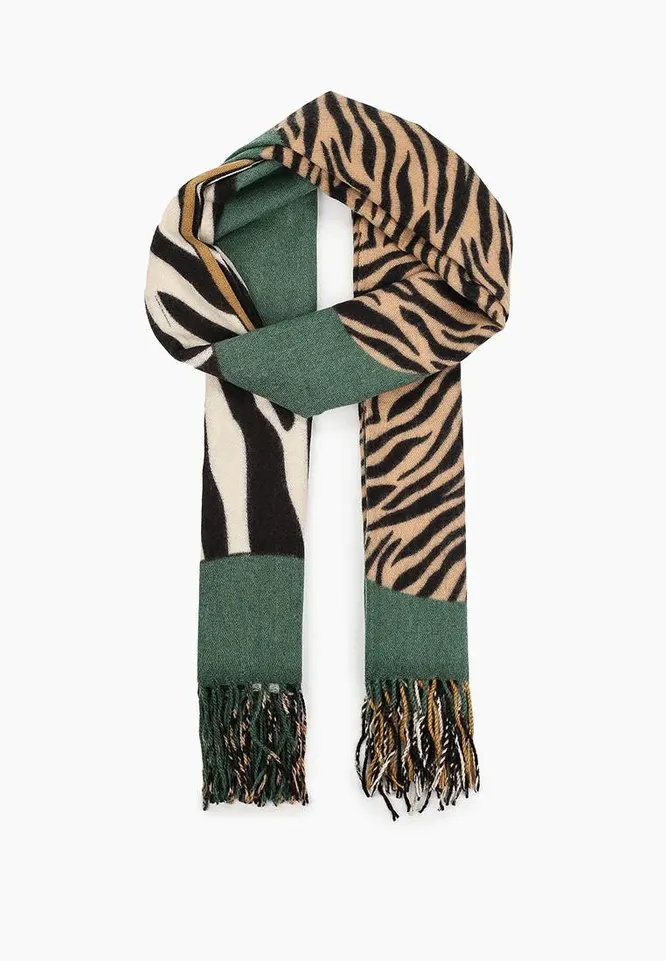 Леопардовый, тигровый или зебровый шарфы мгновенно оживляют образ, но здесь важно учитывать оттенки и сочетания. Бежево-коричневые леопардовые принты подойдут обладательницам светлой и теплой кожи, создавая эффект свежести, а черно-белая зебра будет особенно выигрышной для смуглой или холодной кожи, добавляя контраст и делая лицо более выразительным.