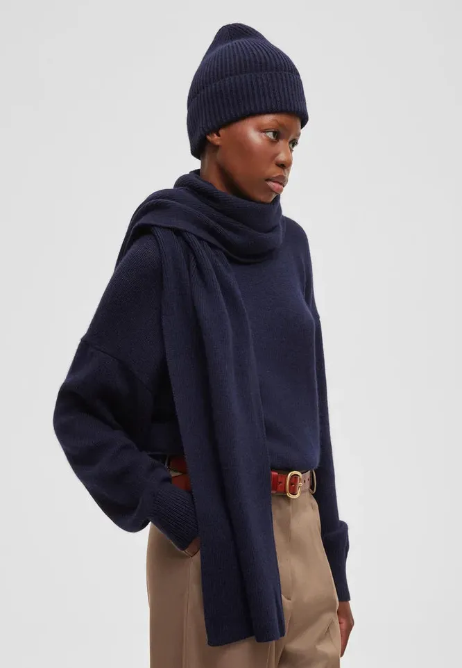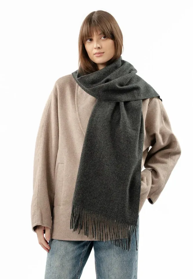 Если вы хотите оставить темные оттенки в образе, попробуйте заменить черный на графитовый, угольно-синий или серый — эти цвета сохраняют элегантность темного оттенка, но мягче обрамляют лицо и подчеркивают глаза, делая кожу визуально свежей. Не менее интересным вариантом могут стать шарфы коричневых оттенков — они выглядит дорого и гармонично сочетаются с любыми цветами верхней одежды, придавая аутфиту завершенность.