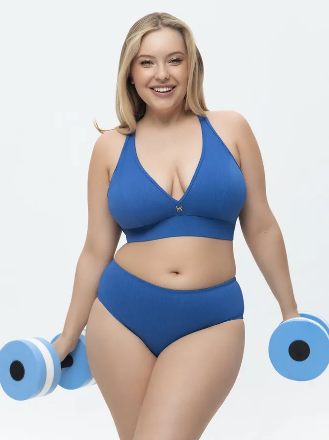 Если ваша грудь примерно по объему равна бёдрам, то могут подойти раздельные спортивные купальники плюс сайз. Топы у них обычно увеличенной длины, поддержка — как у спортивного бра, идет за счёт специального кроя и плотной ткани.