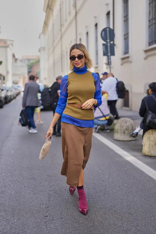 Холодная синева и теплый коричневый — дуэт, который любит подиум и интерьер, но в повседневной моде он часто выглядит мрачно. Два глубоких оттенка спорят между собой, особенно, если не добавить ярких акцентов.
