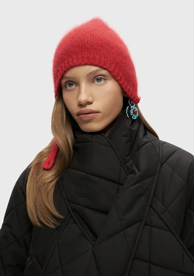 Ярко красный чепчик сделает интереснее даже самый скучный образ с чёрными джинсами и серым пуховиком. Головной убор сделан из ангорской шерсти, которая знаменита своей способностью сохранять тепло. А ещё этот материал невероятно тёплый!