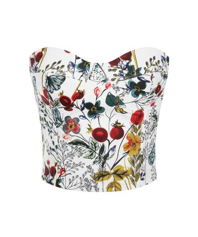 Корсет украшен цветами, ягодами и бабочками, поэтому в нем вы точно не останетесь без внимания и комплементов.