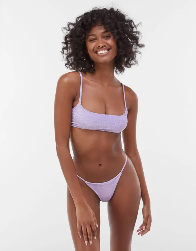 Блестящие купальники стали трендом еще в прошлом году, но прощаться с ними в этом сезоне мы пока не собираемся. Выбирая купальник с люрексом, обратите внимание на один нюанс — дорого смотрятся только раздельные варианты. Слитный блестящий купальник больше напоминает костюмы гимнасток или фигуристок.