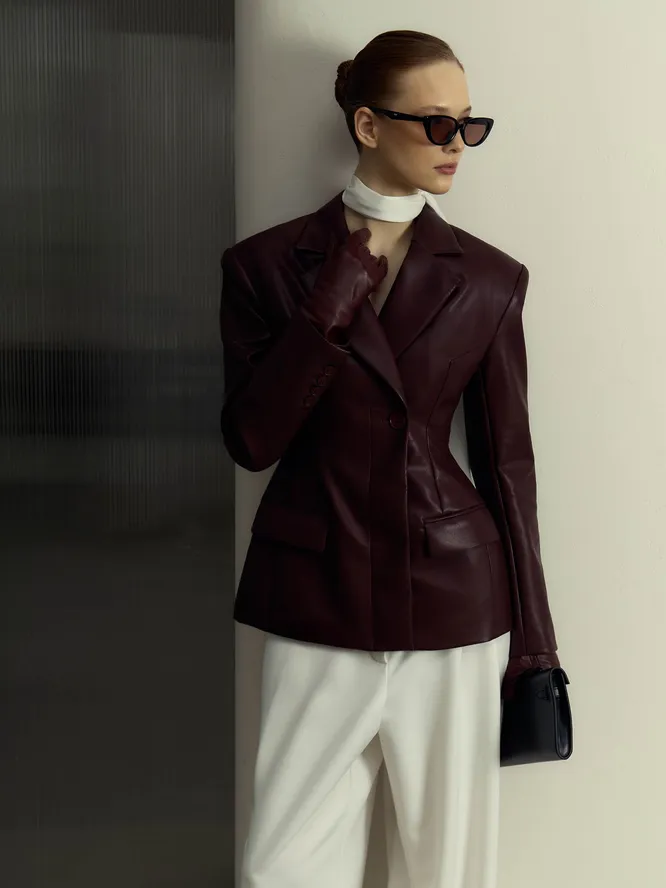 Бордовый цвет, приталенный силуэт, матовая экокожа, массивные плечи — это уже не жакет, а настоящее комбо из самых актуальных трендов этого года. Модель пиджака выглядит очень стильно и дорого благодаря ассиметричному силуэту и акцентным деталям.