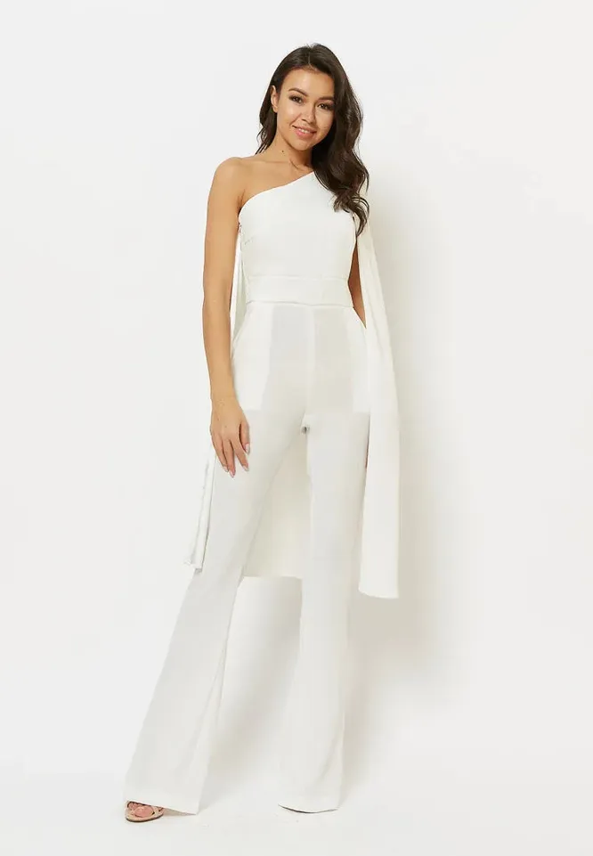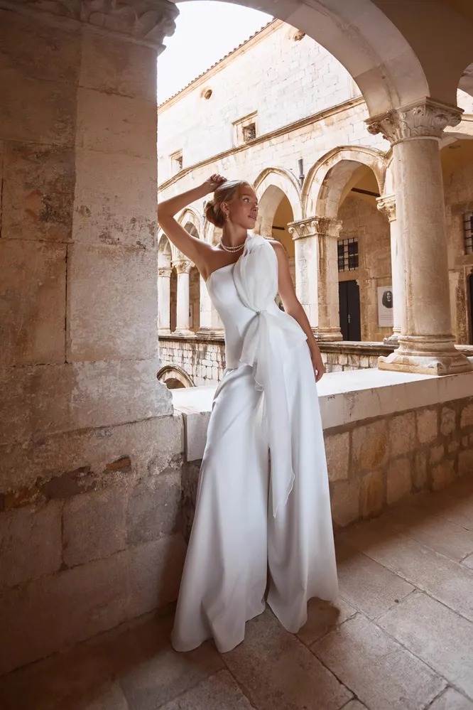Комбинезон на одно плечо декорирован дополнительной драпировкой, которая отвлекает внимание от средней линии тела и даёт возможность невесте расслабиться на свадебном банкете. Фигура будет выглядеть стройной и подтянутой даже после обильного ужина.