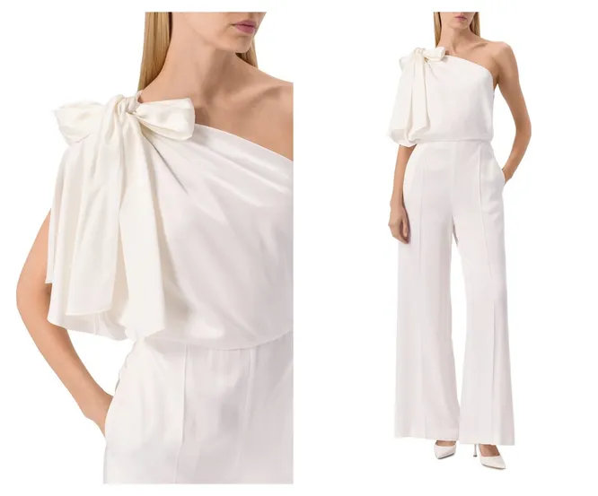 Асимметричный крой этого комбинезона из мягкого твила подчёркнут дополнительным 3D-элементом — объёмным бантом на одном плече. Наряд подойдёт для летней свадьбы в расслабленной обстановке или в качестве второго наряда для неофициальной части торжества.