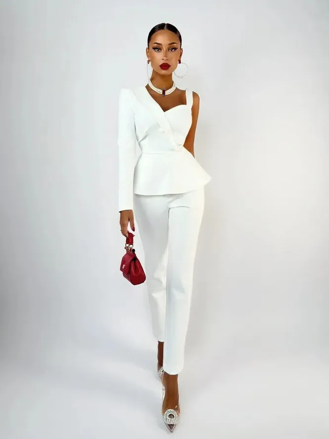 Новый тренд достиг и свадебной моды — причём не только в премиальном сегменте. Если выбор наряда для торжества не ограничивается для вас лишь платьем, вот несколько идей, как разнообразить образ стильным костюмом или комбинезоном с асимметричным кроем «на одно плечо».