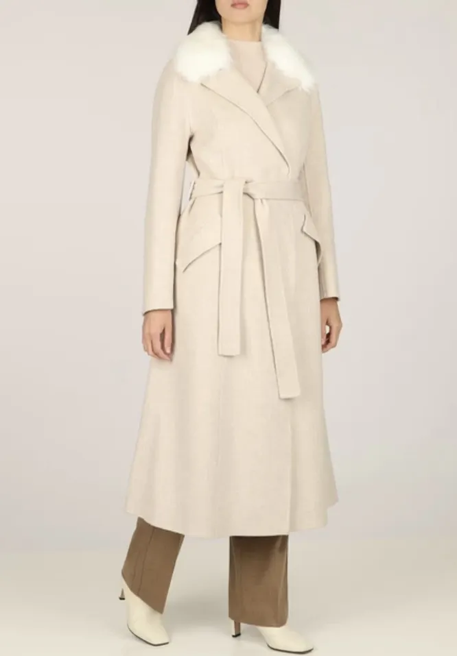 Вариант для тех, кто предпочитает женственную классику. Пальто на запах кремового цвета выигрышно подчеркнет талию, а мех на воротнике добавит образу кокетливую нотку.