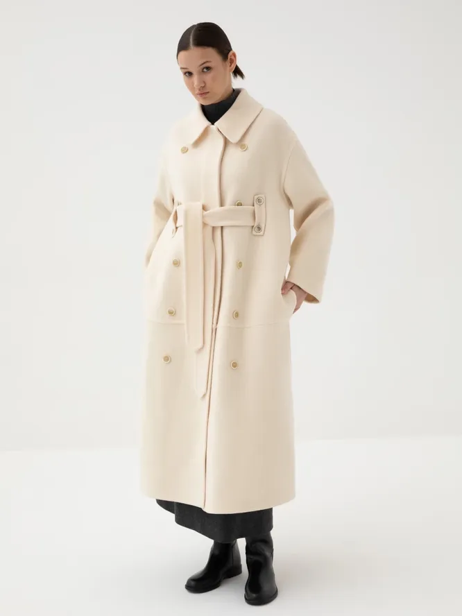 Еще одна роскошная светлая модель, но уже совершенно иной образ. Пальто с запахом — вечный тренд. Оно создает акцент на талии, что визуально создает силуэт песочных часов, о которых мы все так мечтаем.