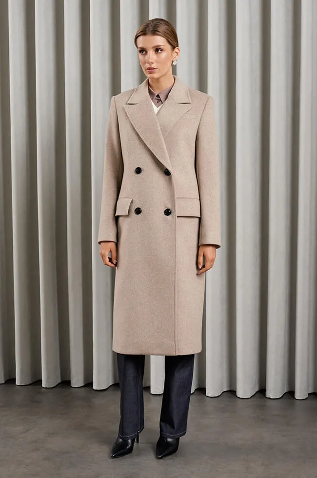Классическое бежевое пальто прямого кроя с прямыми плечами