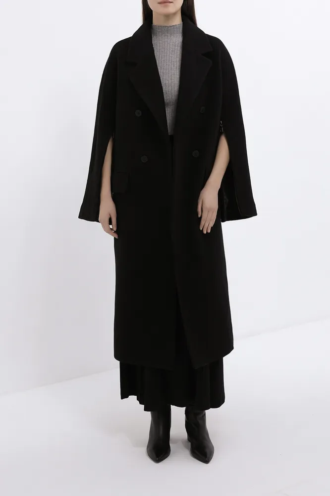 Чёрное пальто в пол прямого кроя с акцентными плечами