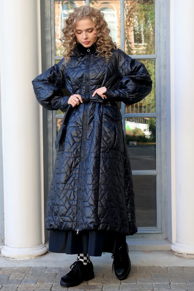 Приталенное стёганое пальто с поясом и акцентными рукавами