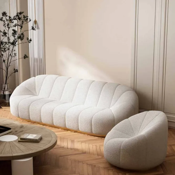Срочно избавляемся от бархата и велюра — в тренде неблестящие уютные и расслабляющие текстуры с внушительным содержанием натуральных волокон: букле, шерсть, твид, вельвет. Ткань букле (в переводе с французского означает «закрученный») — безусловный фаворит дизайнеров в 2025 году. У неё богатая матовая текстура, которая вносит в интерьер ощущение сдержанной элегантности — это та самая «тихая роскошь», к которой мы стремимся уже не первый год. Кроме того, текстурированная ткань идеально подчёркивает изогнутые линии в силуэте мягкой мебели, не создавая лишних переливов и отсветов.