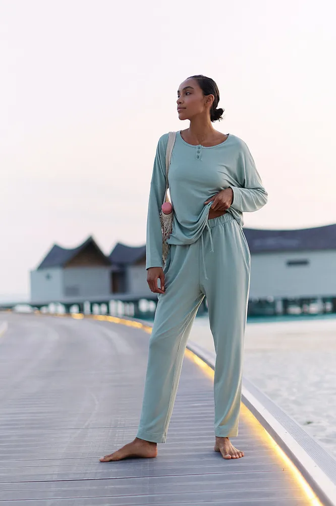 Эта теплая пижама — идеальная домашняя одежда для любительниц комфорта. Комплект из 4 предметов продается отдельно, так что вы сами сможете составить идеальный сет для вашего домашнего микроклимата: мягкие брюки на резинке, лонгслив с планкой, майка и шорты — все в благородном оттенке зеленого чая. Пижама выполнена из натурального материала: бамбукового волокна с небольшим добавлением эластана для комфортной посадки. В ней спокойно можно спать, заниматься делами и выйти на небольшую прогулку.